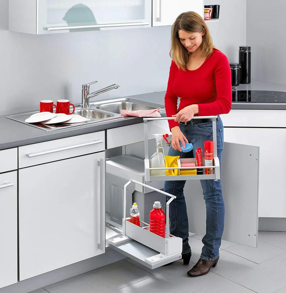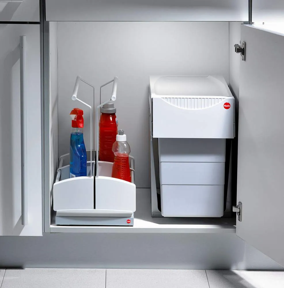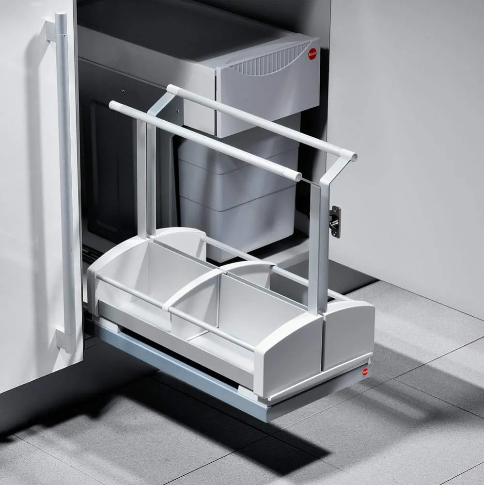 Элегантная выдвижная система с ручками-релингами из алюминия. Две переносные емкости легко снимаются с платформы. Отличное дополнение к мусорному ведру. Чистящие средства можно перенести непосредственно к месту, где они будут применяться. Полное выдвижение с мягким закрыванием Soft-Control обеспечивает удобный доступ. Подходит для дооснастки уже эксплуатируемых распашных шкафов.