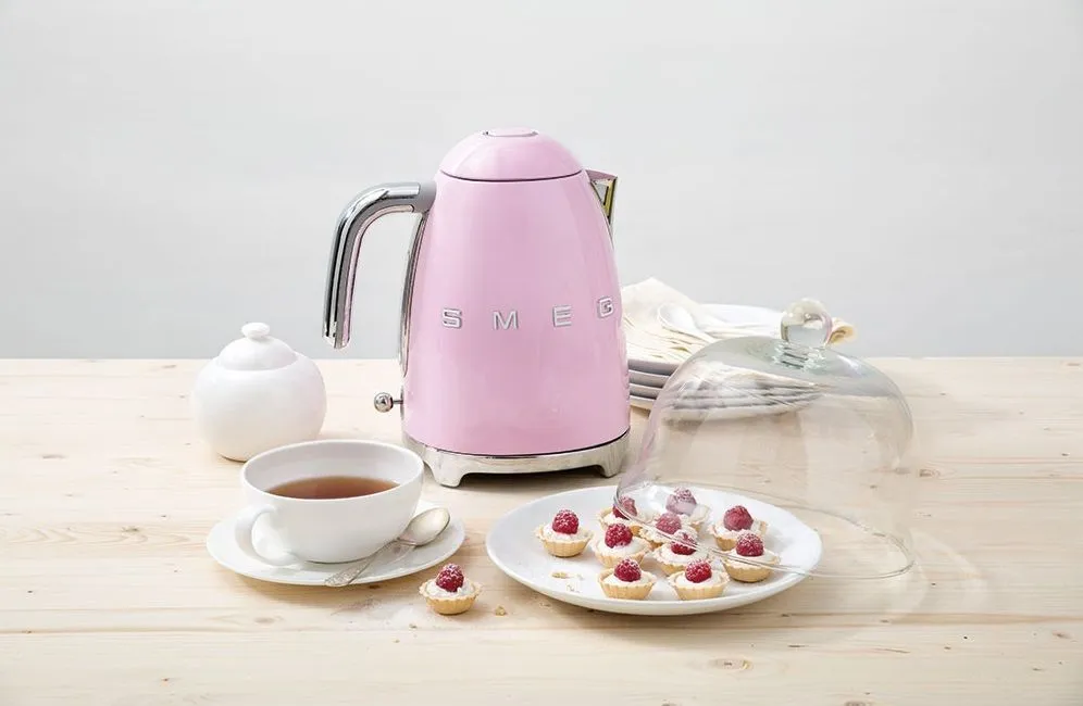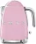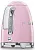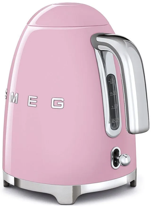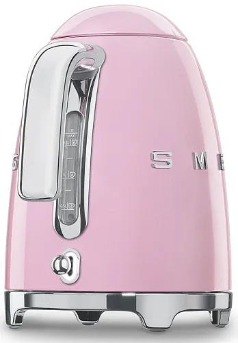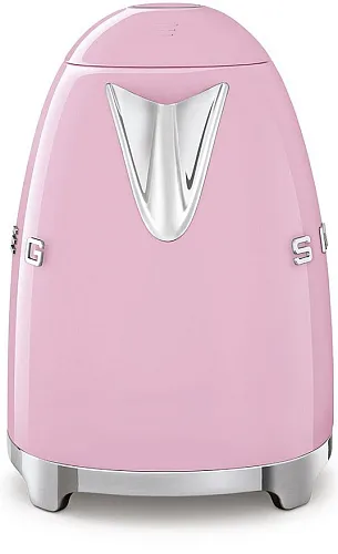 Модель Smeg KLF03PKEU из коллекции «стиль 50-х» выполнен из нержавеющей стали в розовом цвете. Электрический чайник обладает объемом в 1.7 литра, при достижении температуры в 100°С нагрев автоматически приостанавливается. Также автоматическое отключение происходит в момент снятия прибора с базы для максимального удобства. Эргономичная конструкция прибора предусматривает мягкое открывание крышки, нескользящие ножки и специальное отделение для хранения шнура в базе.