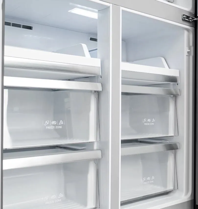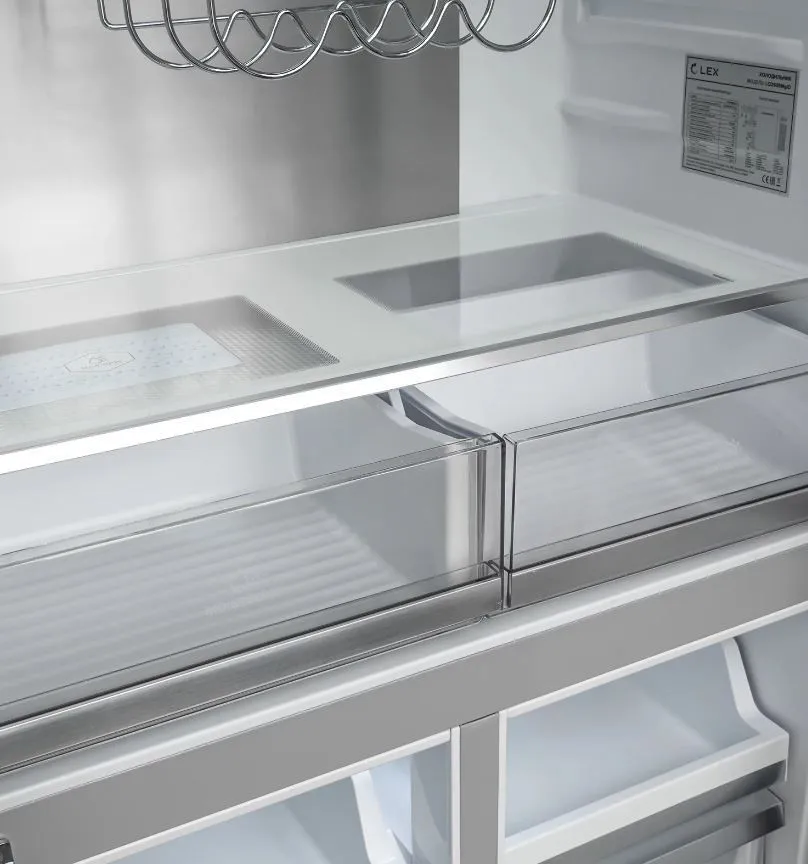 Холодильник LEX LCD 505 станет отличным выбором для большой семьи и стильной кухни. Объем 505 литров позволит разместить все, чего вам захочется. Охлаждение и заморозка происходят по системе No Frost, без образования инея, поэтому вам не нужно тратить время на размораживание. Современный инверторный компрессор работает эффективнее, тише и быстрее обычного, а технология LEX Volume Stream Air обеспечивает более равномерное охлаждение. Задняя стенка холодильной камеры покрыта металлом с высокой теплопроводностью, благодаря чему система охлаждения быстрее выравнивает колебания температуры. Модель типа CROSS DOOR имеет верхнее холодильное и два независимых нижних морозильных отделения. Такая конструкция помогает поддерживать подходящие условия хранения внутри каждой камеры, даже если вы часто открываете дверцы. Диапазон температур: +8…–23 °C, но с функцией суперзаморозки можно быстро снизить температуру в морозильном отделении до –28 °С. Похожий режим есть и в холодильной камере. Холодильник оснащен функцией сохранения температуры в течение 12 часов, которая выручит при отключении электричества. Благодаря понятной электронной панели управления и яркой подсветке вы всегда сможете точно контролировать условия хранения. А когда такой возможности нет, будет достаточно одного нажатия, чтобы автоматически установить в каждом отделении температуры, которые позволяют экономить энергию, но не влияют на качество хранения продуктов. Модель представлена в восьми вариантах оформления, которые отличаются цветом, текстурой и материалом отделки.