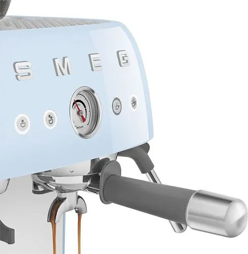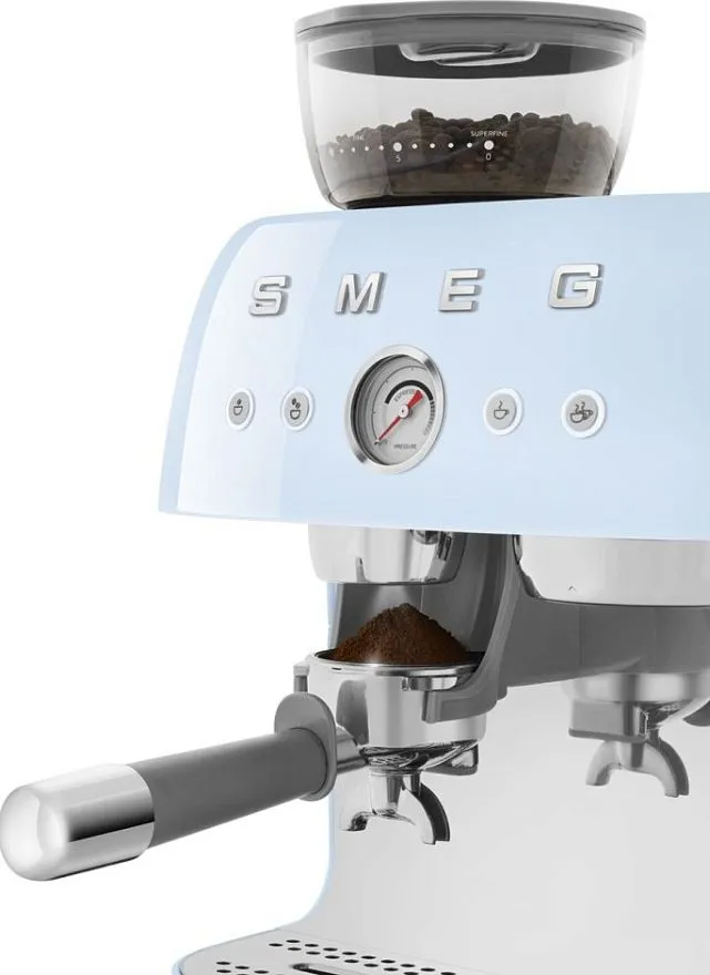 Smeg EGF03PBEU — стильная эспрессо-кофемашина, выполненная в пастельном голубом цвете. В качестве нагревательного элемента используется двойной термоблок — специальный механизм, обеспечивающий порционную подготовку воды. Для равномерного помола, при котором сохраняются все ароматы напитка, предусмотрена встроенная кофемолка. Управление устройством осуществляется при помощи кнопок и рычага. Капучинатор выполнен из нержавеющей стали.