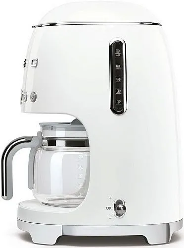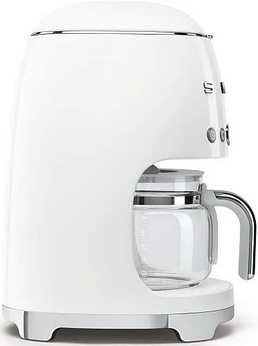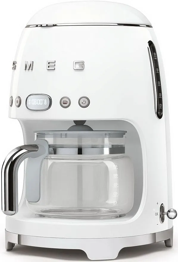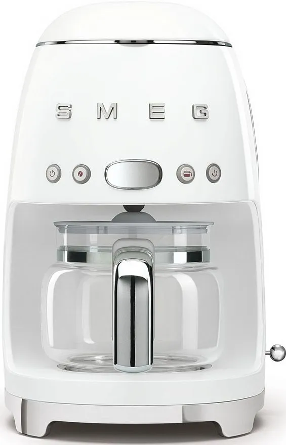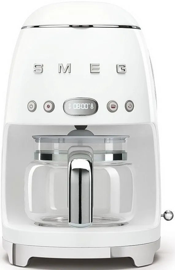 Капельная кофеварка Smeg DCF02WHEU — модель белого цвета из серии «Стиль 50-х годов». Удобная панель управления оснащена диспелеем и цифровыми часами. Свежеприготовленный кофе сохраняет температуру до 20 минут, так как стеклянный кувшин стоит на специальной платформе.