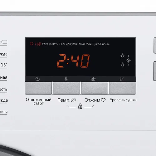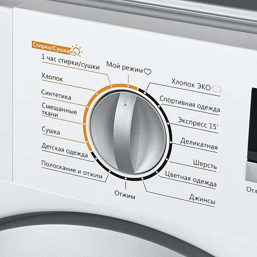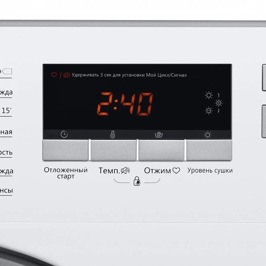 Количество режимов стирки: 16 (Смешанные ткани, Хлопок, Хлопок ЭКО, Шерсть, Деликатные ткани, Экспресс 15”, Джинсовая одежда, 1 час стирки/сушки, Детские вещи, Спортивная одежда, Синтетика, Отжим, Сушка, Полоскание и отжим, Цветные ткани, Мой режим)