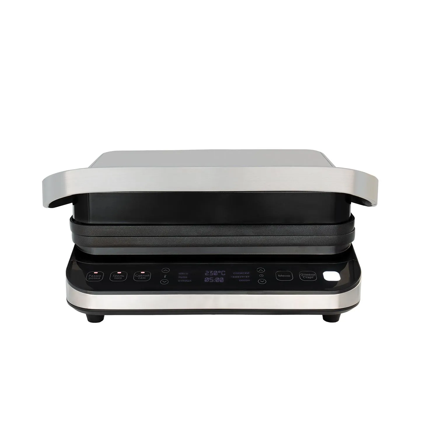Компактный электрогриль мощностью 2000 Вт с электронным управлением LXGR 5005 позволяет быстро и качественно приготовить Ваши любимые блюда из мяса, рыбы, овощей с помощью 6 автоматических режимов приготовления, а также расширить свои кулинарные умения с помощью индивидуальных настроек в режиме СДЕЛАЙ САМ (DIY), используя регулировку температуры от 80*С до 230*С и времени приготовления от 30 сек до 60 минут, по Вашему желанию. Приятным дополнением также станет возможность использовать двухсторонние антипригарные пластины: рифленая – подходит для жарки стейков из мяса, рыбы, птицы, котлет, гамбургеров, овощей, а плоская – предназначена для приготовления яичницы, омлета, оладьев, блинов, сэндвичей, тостов, морепродуктов. Комбинируйте стороны пластин по Вашему усмотрению! Вместительный маслоприемник, как и панели, легко снимается для обслуживания и удобен в хранении. Цветовой сенсор индикатор всегда покажет степень готовности продукта, а конструктивная особенность открывания пластин на 180 градусов – позволит превратить Ваш прибор в полноценную жаровню.