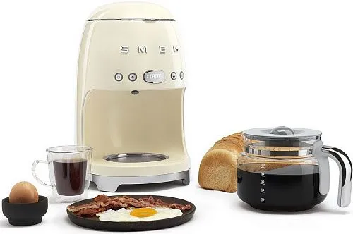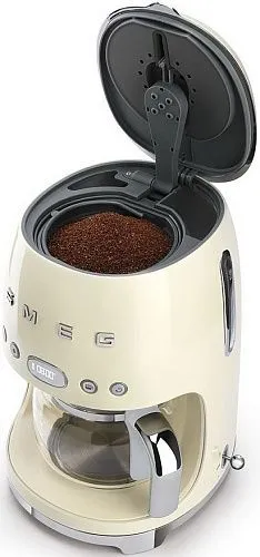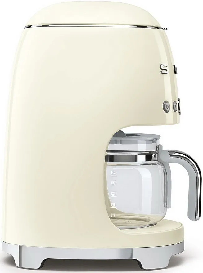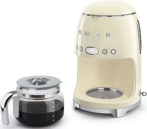 Капельная кофеварка Smeg DCF02CREU — модель кремового цвета из коллекции в стиле 50-х годов. Прибор оборудован большим резервуаром для воды 1,4 литра, удобной панелью управления с дисплеем. Крепость кофе можно регулировать.