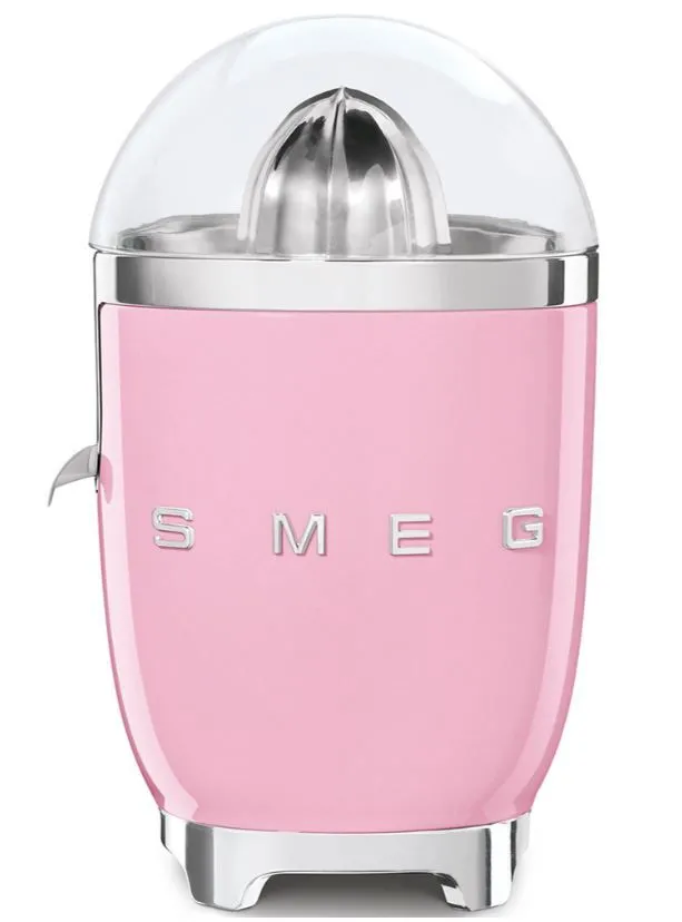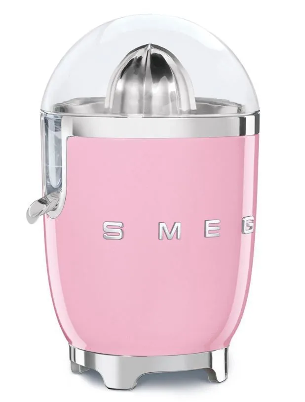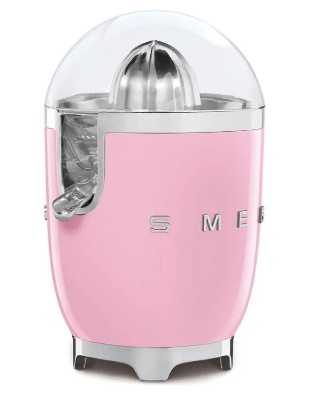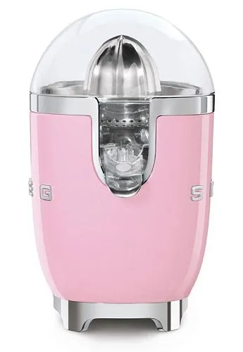 Соковыжималка Smeg CJF11PGEU представлена в розовом цвете, она оснащена ручным отжимом, что дает возможность автономности и тихой работе. Также стиль устройства разработан дизайнерами в ретро стиле 50-х годов.