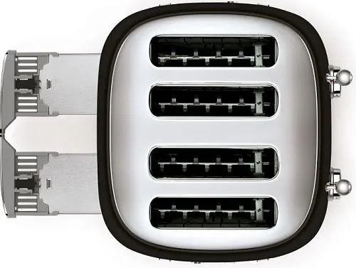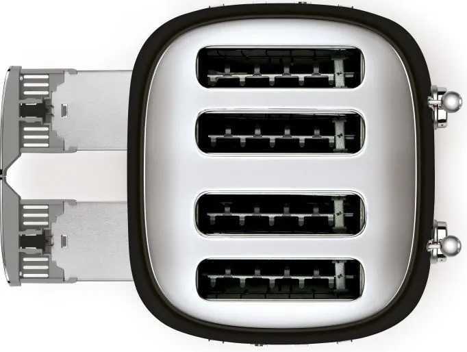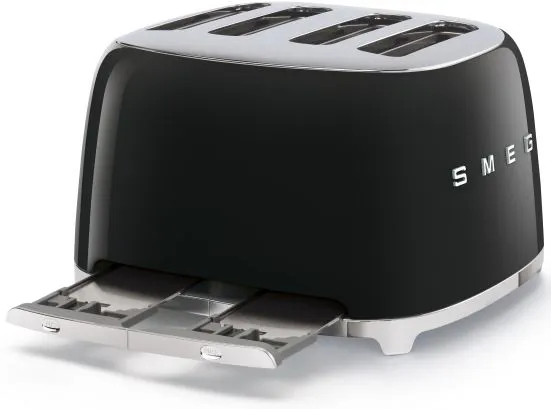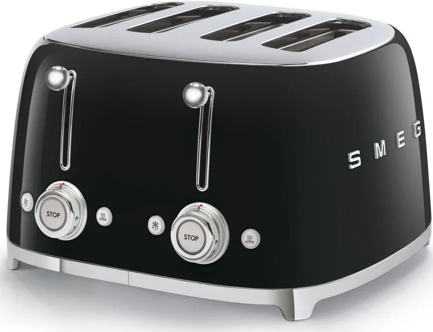 Тостер Smeg TSF03BLEU — модель на четыре слота из серии «стиль 50-х годов». Выполнен в черном цвете. Шесть уровней мощности обеспечивают оптимальное поджаривание для любого вида бутербродов и сендвичей. Две независимые панели управления позволяют настроить режимы для разных отделений.