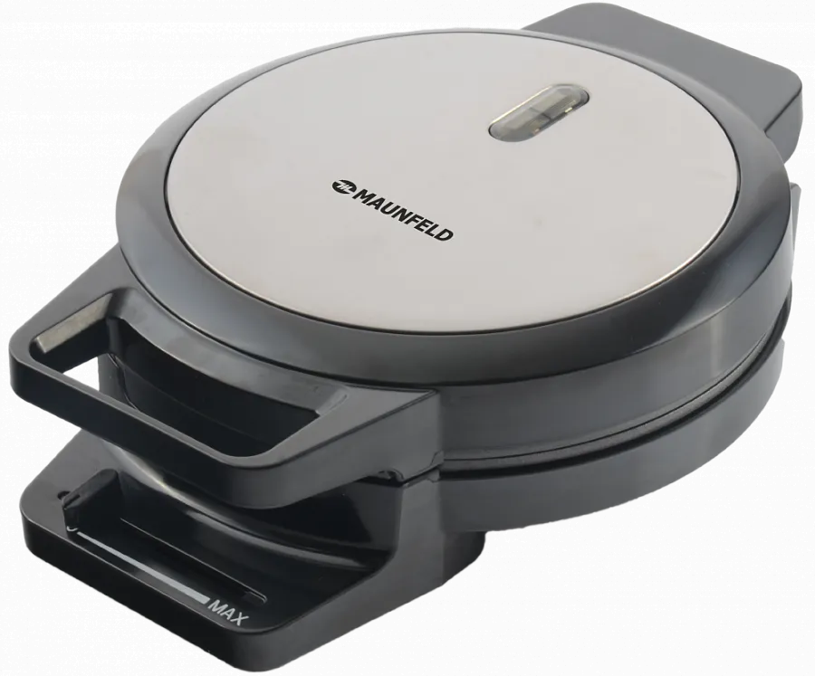 Компактная вафельница в круглом дизайне. Корпус из черного пластика с металлической вставкой, индикатором нагрева и готовности.