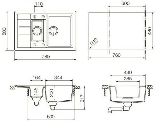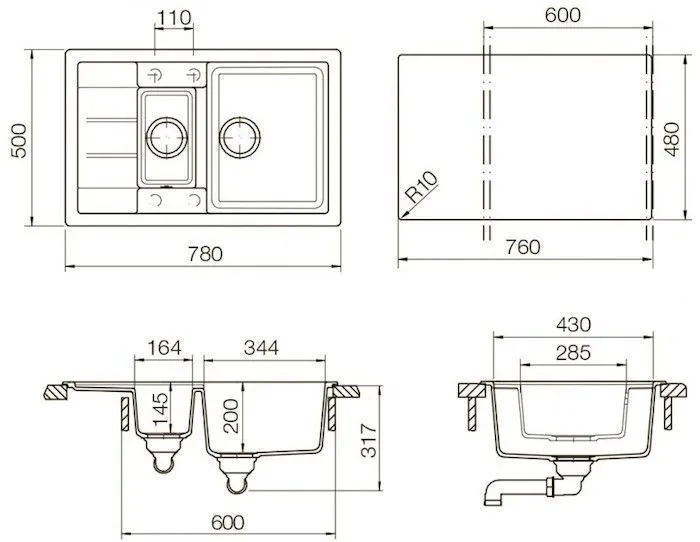 Отводная арматура с клапаном-автоматом 3 1/2" и переливом, сифон с возможностью подключения посудомоечной или стиральной машины.