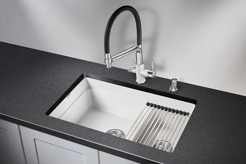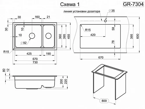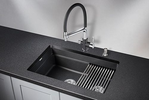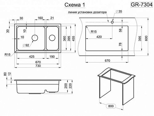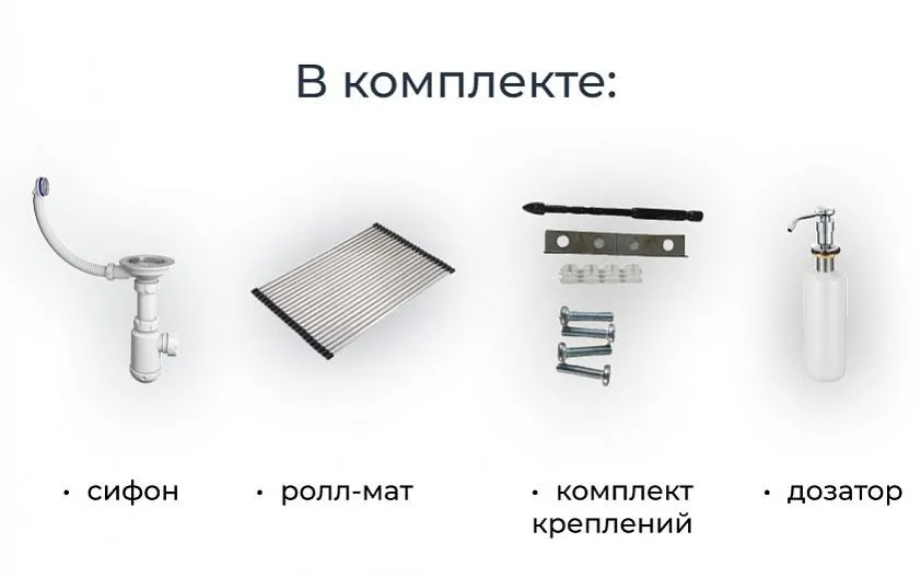 Двухсекционная мойка прямоугольной формы для установки под столешницу в шкаф 800мм. В каждой чаши мойки есть удобная площадка для установки ролл-мата или разделочной доски. Мойка выполнена из кварцевого композитного материала высокой плотности и гигроскопичности, что обеспечивает не менее 20 лет надежной эксплуатации. Ролл-мат и дозатор из нержавеющей стали уже включены в комплект. Выберите GRANULA KS-7804U, чтобы получить привлекательный и удобный аксессуар для вашей кухни.