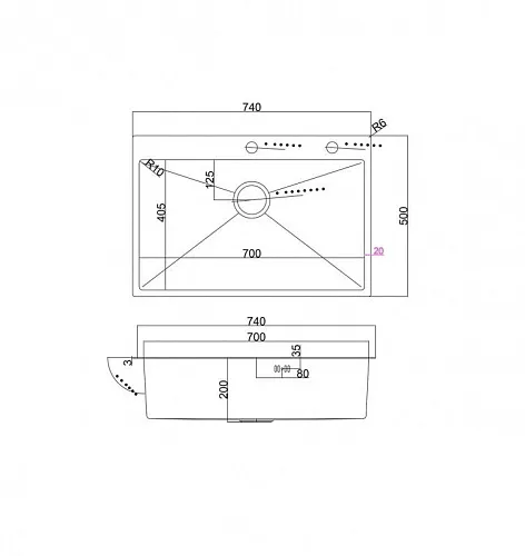 Дизайнерская мойка имеет размеры 740 x 500 мм и R5 радиус закругления с внешней стороны. Внутренние углы с R10 радиусом закругления.