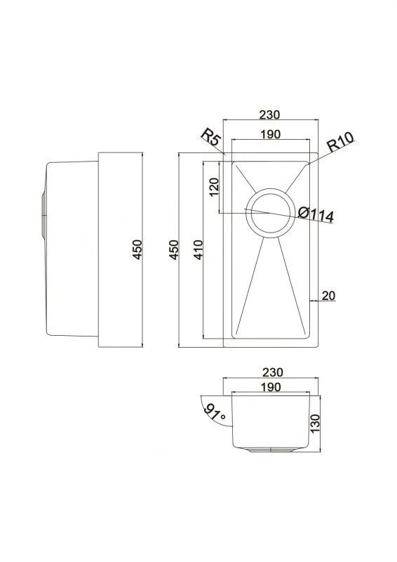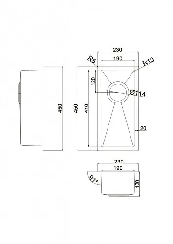 Габаритные размеры мойки всего: 230 x 450 мм и R10 радиус закругления с внутренней стороны.