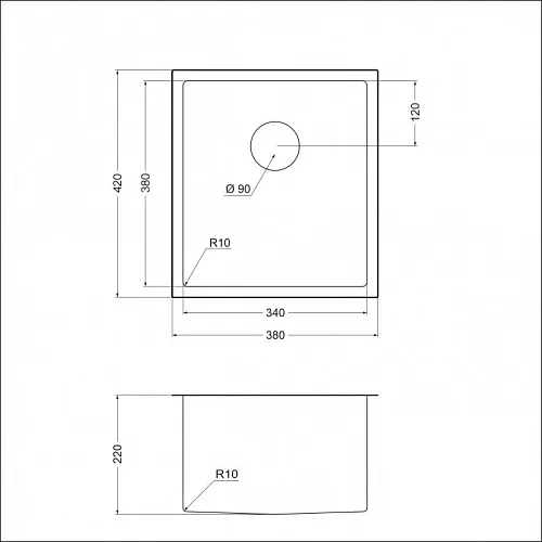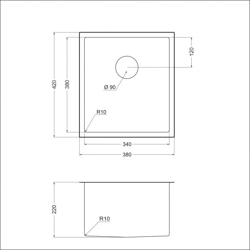 Кухонная мойка EMAR EMB-130, тип исполнения мойки — одна чаша (одно-чашевая). Модель мойки выполнена с одной чашей. Мойка имеет размеры 380 x 420 мм и R10 радиус закругления. Внутренние стороны также, с R10 радиусом закругления.