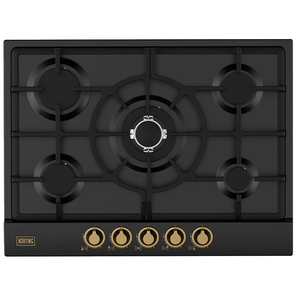 5 высокоэффективных конфорок, сверхмощная конфорка WOK 3,8 кВт, автоматический электроподжиг, газ-контроль каждой конфорки, чугунные решетки, металлический шильд с логотипом Korting,