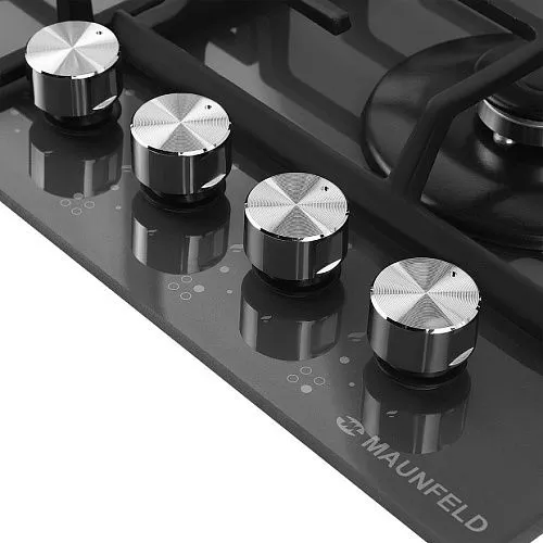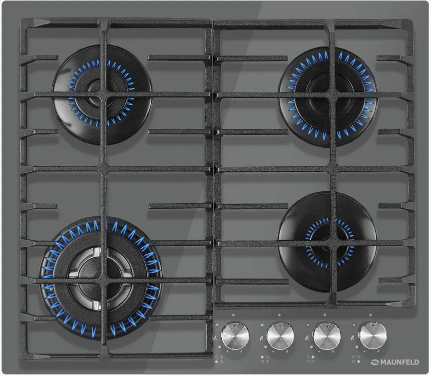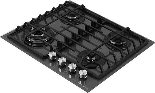 Панель выполнена из закаленного стекла. В данной модели установлены высококачественные итальянские горелки SABAF. Три стандартные конфорки мощностью 1700 Вт, 2600 Вт, 1000 Вт и одна WOK-конфорка с двойным пламенем мощностью 3800 Вт.