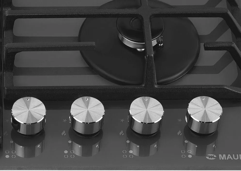 Подача газа и электроподжиг конфорок осуществляется с помощью поворотных регуляторов - полнотелых цельнометаллических ручек. Для простоты использования около каждой ручки нанесены информационные изображения: используемая конфорка, подача газа выключена, электроподжиг, максимальное пламя и минимальное пламя.