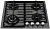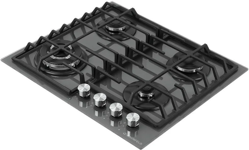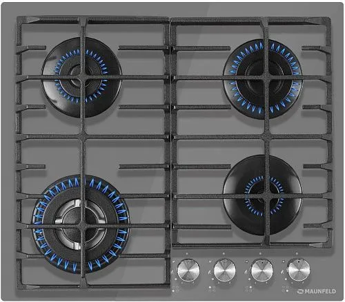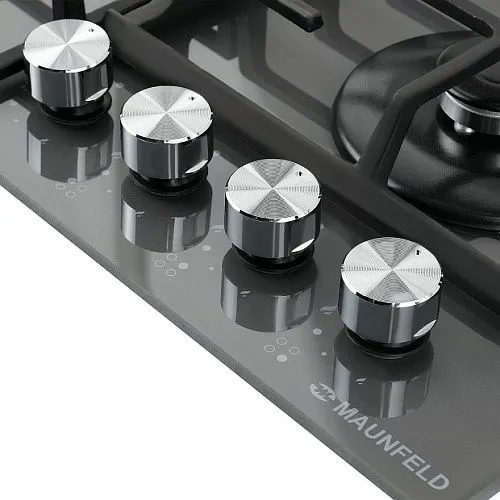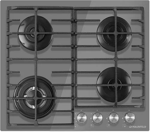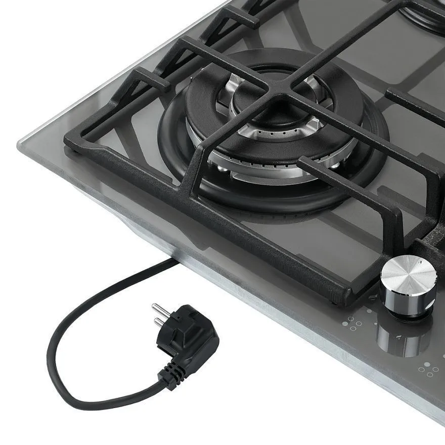 Панель выполнена из закаленного стекла. В данной модели установлены высококачественные итальянские горелки SABAF. Три стандартные конфорки мощностью 1700 Вт, 2600 Вт, 1000 Вт и одна WOK-конфорка с двойным пламенем мощностью 3800 Вт.