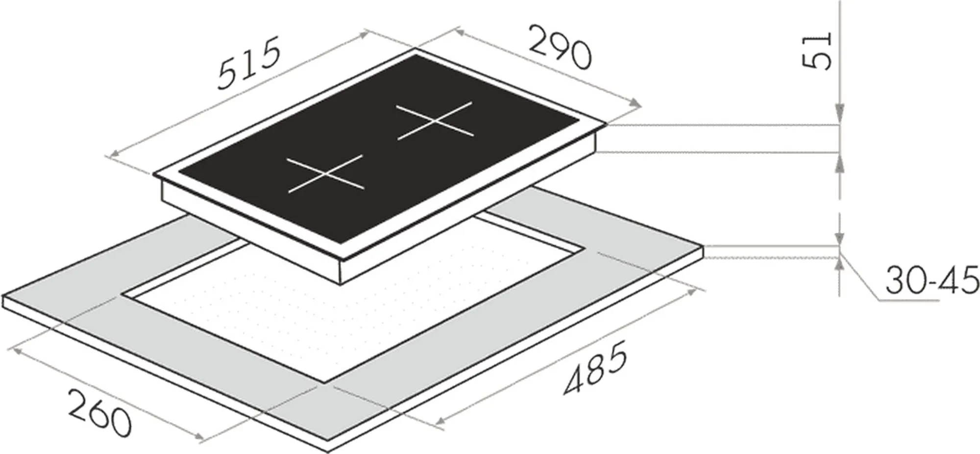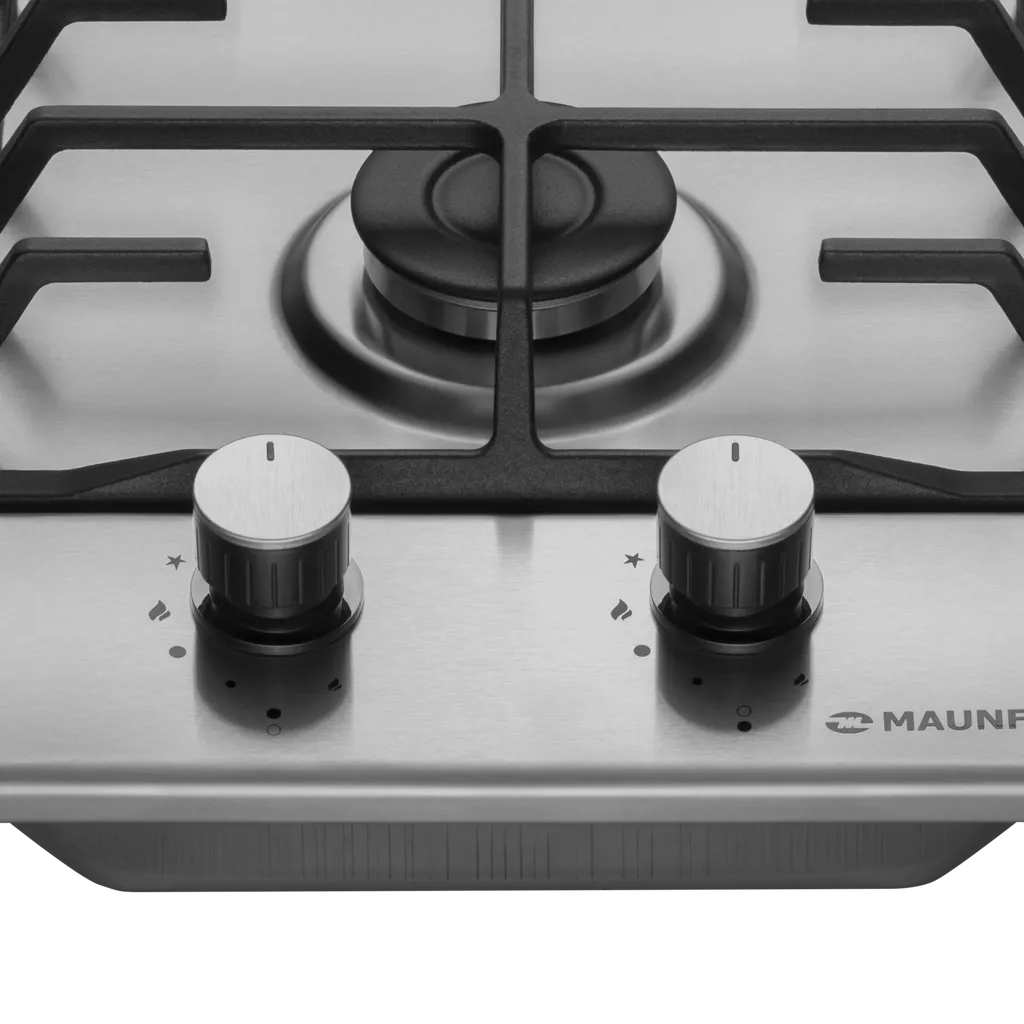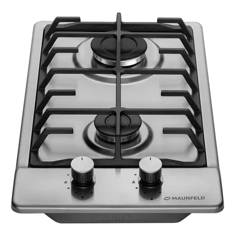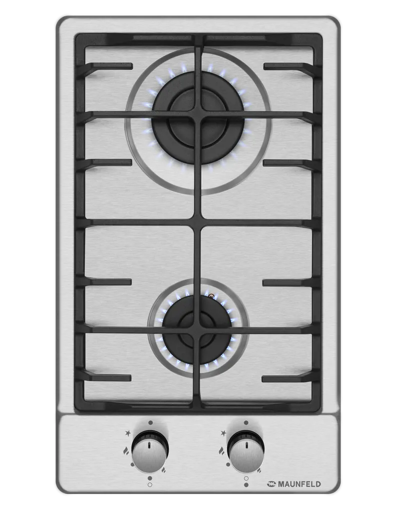 Панель выполнена из нержавеющей стали. В данной модели установлены высококачественные итальянские горелки «Sabaf». Две конфорки разного диаметра с мощностью 1700 Вт и 2600 Вт. Чугунная решетка имеет крестообразные соединения над конфорками, что позволяет готовить в посуде разного диаметра, не используя специальные подставки.