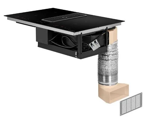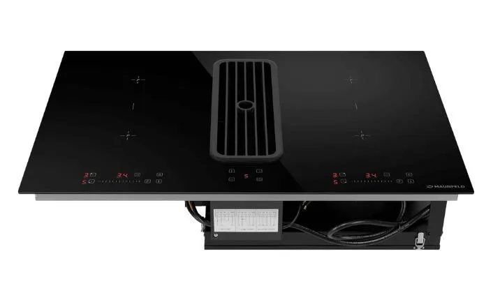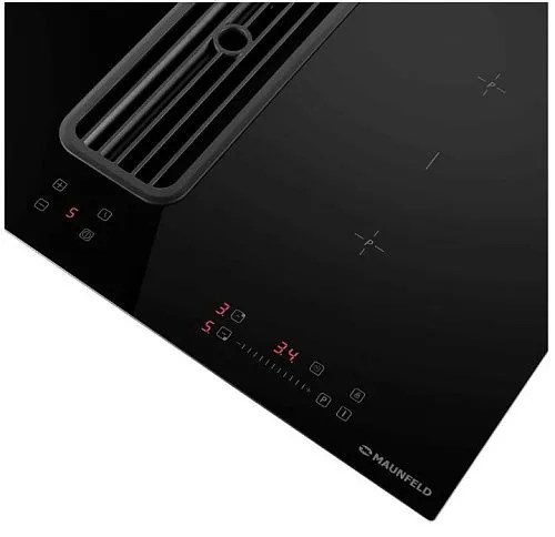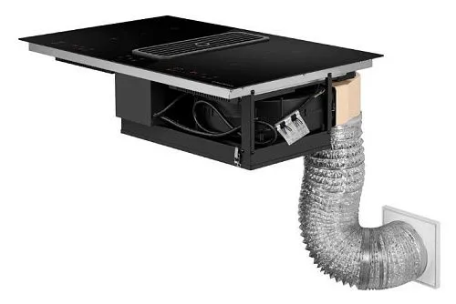 В варочную панель встроена вытяжка, поэтому отдельного прибора для очистки воздуха вам не понадобится. Все запахи и испарения не успеют покинуть зону плиты. Подключение вытяжки подразумевает два варианта: 1. в вентиляционное отверстие. 2. работа в режиме рециркуляции с использованием угольного фильтра.
