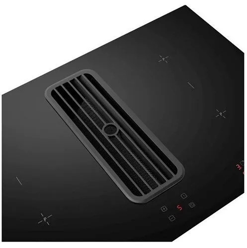 Четыре независимые варочные зоны расположены на черном закаленном стекле. В центре находится элегантная и прочная решетка, которая скрывает мощную зону вытяжки.