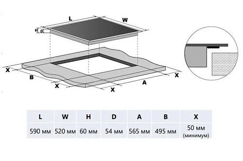 | Ширина варочной поверхности | 590 мм | |