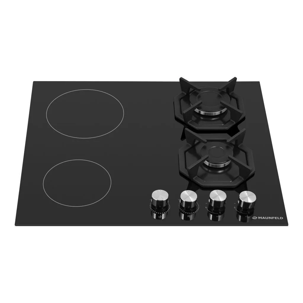 Стильная встраиваемая комбинированная варочная панель шириной 60 см - идеальное сочетание газовой и электрической плит. Панель черного цвета выполнена из закаленного стекла толщиной 8 мм, устойчивого к царапинам, сколам и постоянным перепадам температур. Может работать как от магистрального газа, так и от газа в баллоне (тип G30), для этого достаточно поставить специальные жиклеры французской фирмы SOURDILLON, имеющиеся в комплекте.
