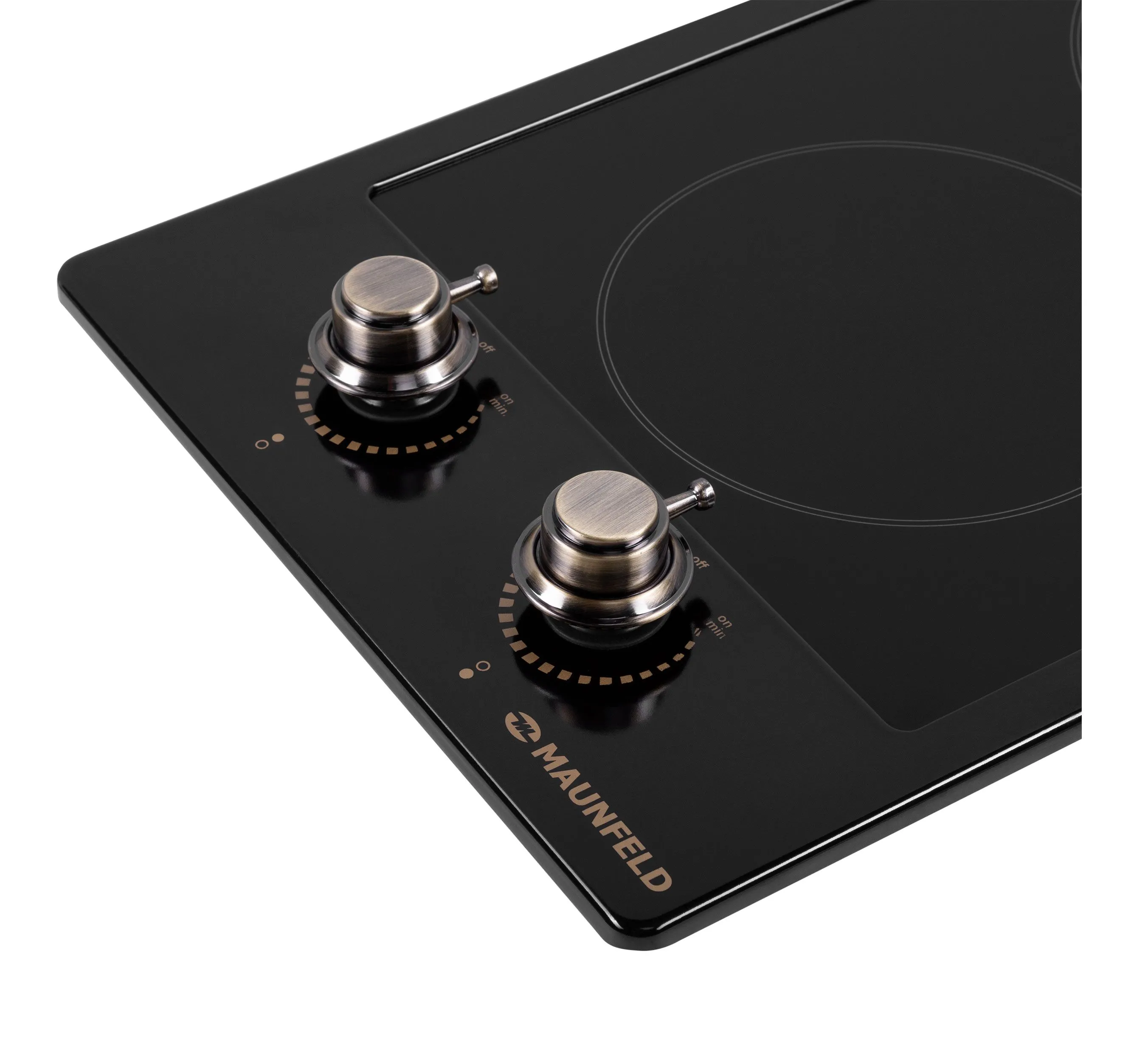Механическое управление , расположенное на фронтальной поверхности, дает возможность выбрать уровень мощности для каждой конфорки (от 0 до 9)
