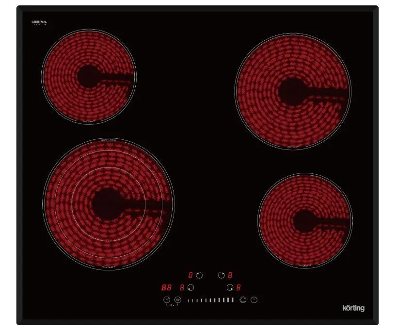 Зоны нагрева Korting оборудованы современными нагревательными элементами HiLight. В этих конфорках в качестве нагревательного элемента применяется уложенная змейкой лента из высокоомного сплава, конфорка достигает установленной рабочей температуры буквально за считанные секунды, позволяет плавно регулировать мощность, излучаемое тепло очень равномерно распределяется по всей рабочей зоне.