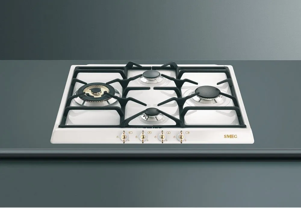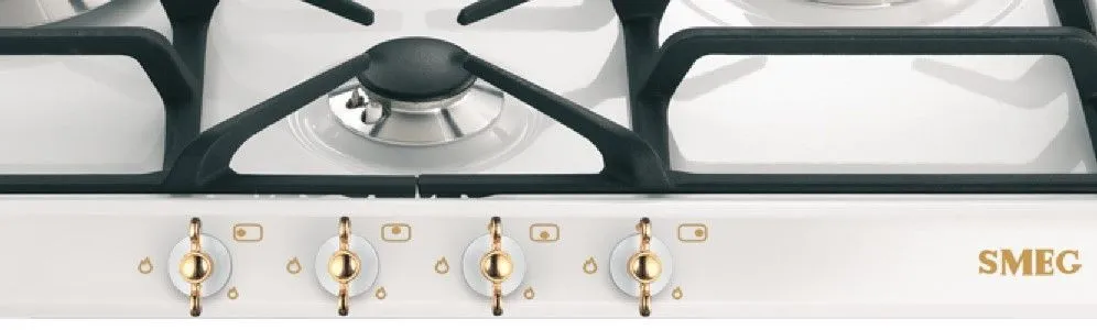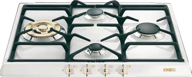 SMEG SPR864BGH — это газовая варочная панель в белом цвете, устанавливается непосредственно на столешницу, относится к коллекции Coloniale. Выполнена в классическом стиле с золотистой фурнитурой, смотрится очень изящно, утонченно, эффектно и приятно радует глаз. Благодаря сочетанию таких цветов создается ощущение, что изделие выполнено в ретро-стиле, т. к. такие оттенки добавляют некоторой старины, во многом благодаря позолоте. Габариты прибора составляют: 3 сантиметра в высоту, 60 в ширину и 50 в глубину, это средние габариты, нет ощущения громоздкости или перегруженности пространства.
