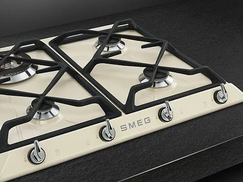 Поверхность входит в серию Victoria, она выполнена из высококачественной нержавеющей стали, покрытой эмалью нежного кремового цвета. Полностью встраиваясь в столешницу, она может быть размещена в любом удобном месте. Решетки из чугуна являются устойчивыми и надежными, они не деформируются под большим весом, не боятся высоких температур и в то же время легко очищаются. Поворотные переключатели расположены таким образом, чтобы они не нагревались во время работы и можно было в любой момент отрегулировать интенсивность пламени.