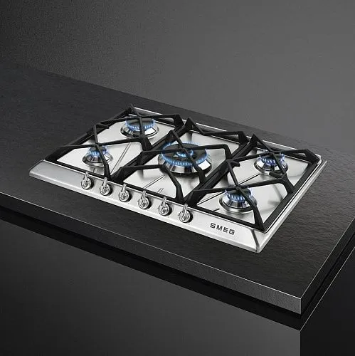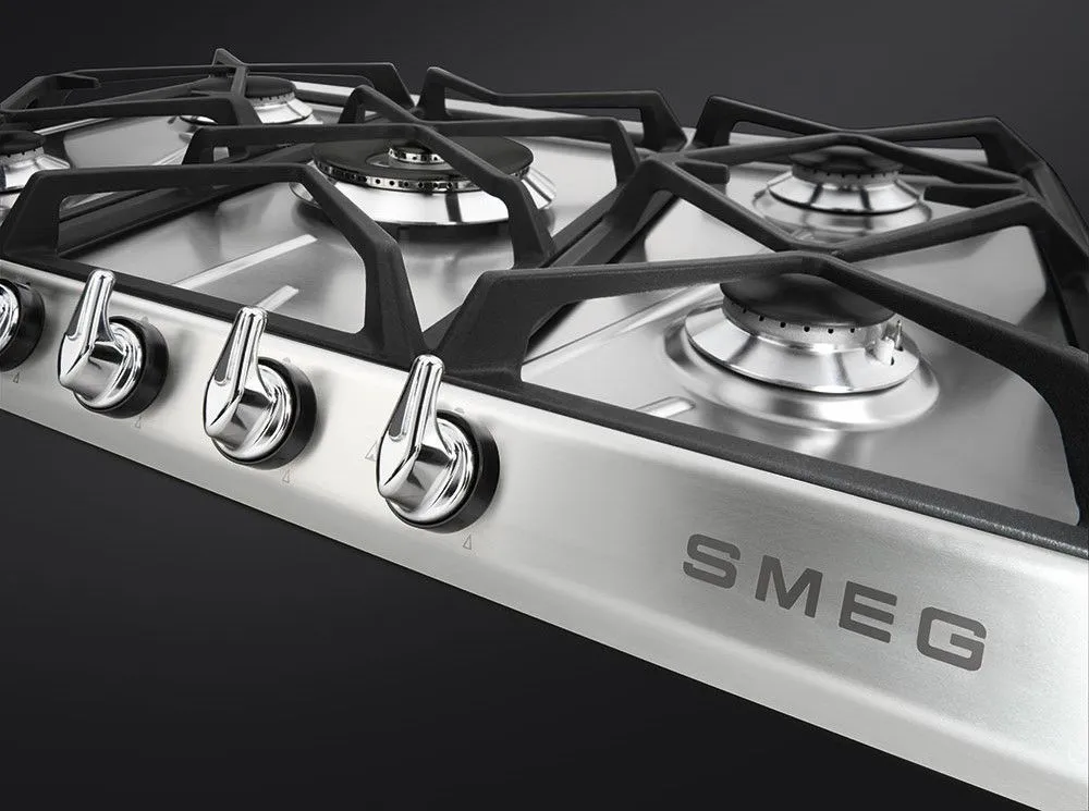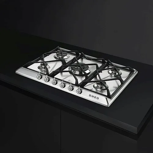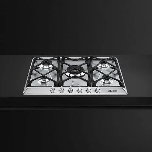 Smeg SR975XGH — варочная панель с основанием из матовой нержавеющей стали. Модель снабжена пятью газовыми горелками и дополнена чугунными решетками. Для удобства эксплуатации предусмотрена система автоматического электроподжига, обеспечивающая возможность управления устройством с помощью одной руки.