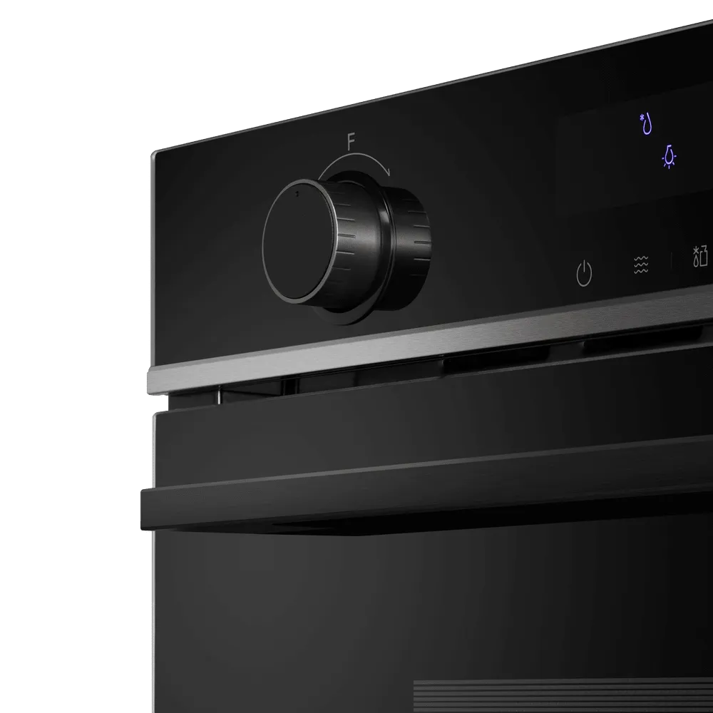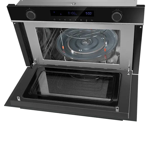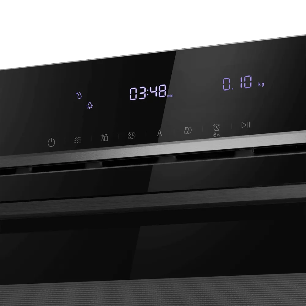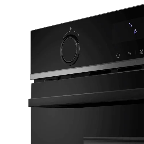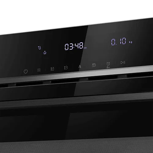 Передняя панель выполнена из стекла. Свет зажигается при открытии дверцы. Настройка программ и таймера осуществляется при помощи сенсорного дисплея.