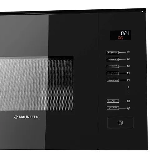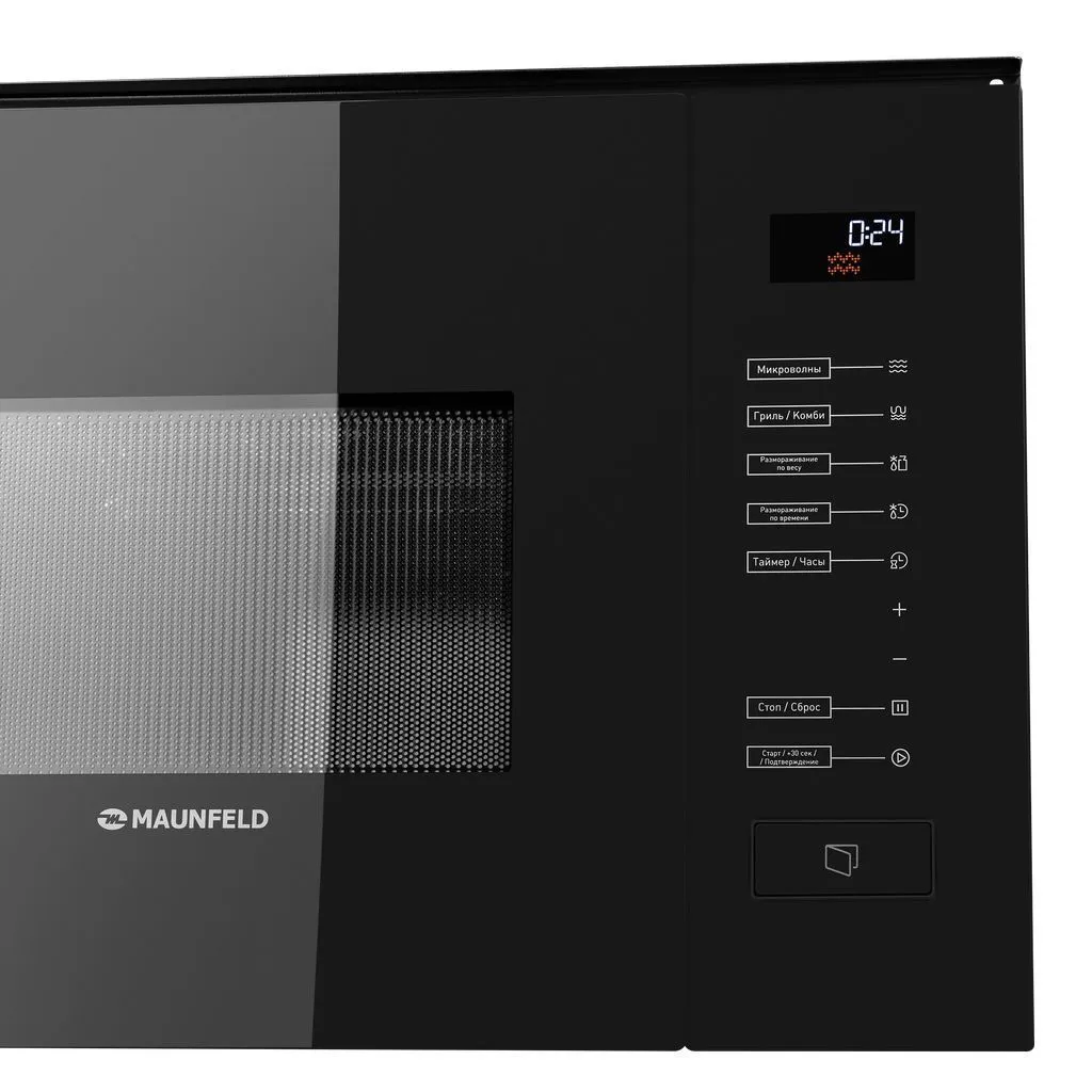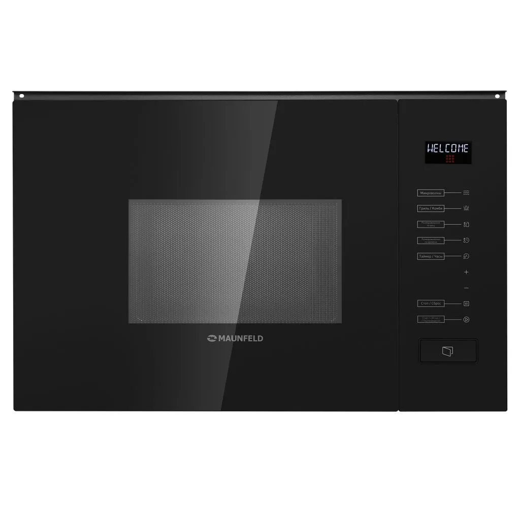 Встраиваемая микроволновая печь из нержавеющей стали с фасадом из закаленного стекла. Полностью сенсорное управление с дисплеем.