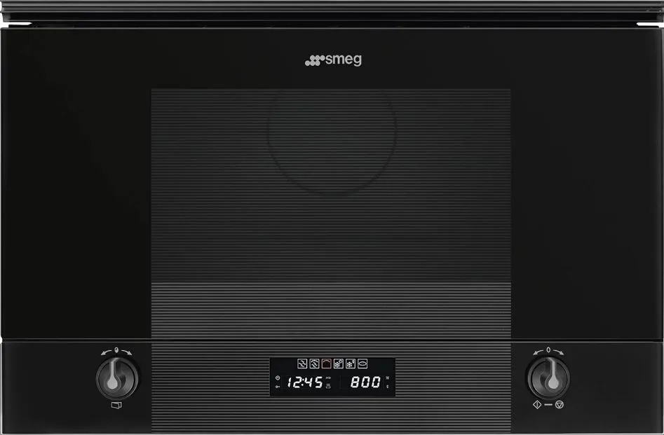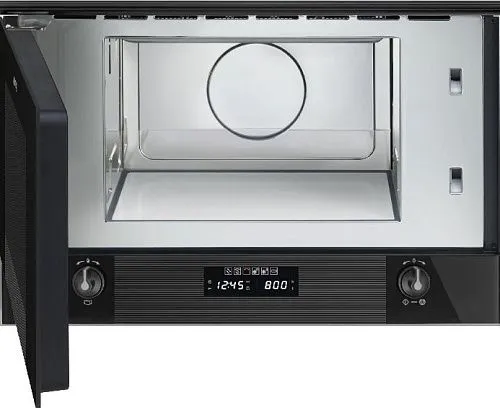 Микроволновая печь Smeg MP122B3 выполнена в черном цвете. Внутренняя камера выполнена из нержавеющей стали, благодаря чему не подвергается образованию коррозии. Вместо поддона гладкая керамическая поверхность.