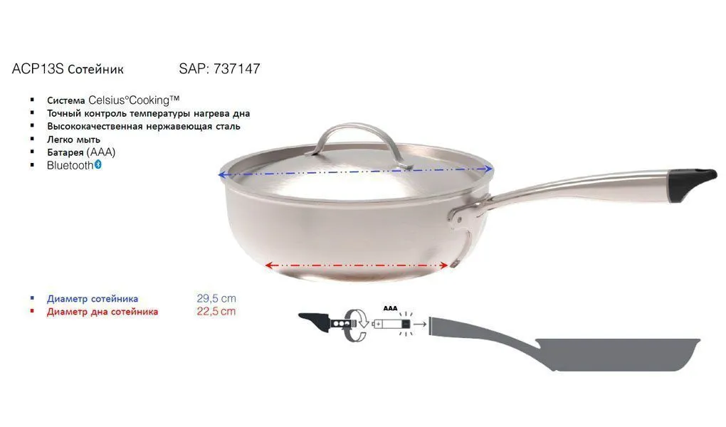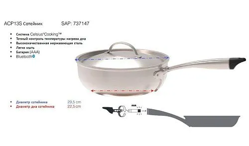 Особенностью этого сотейника является система Celsius Cooking, которая обеспечивает точный контроль температуры нагрева дна. Это позволяет достичь идеальных результатов при приготовлении любых блюд. Благодаря Bluetooth-соединению, вы можете управлять процессом приготовления даже на расстоянии. Питание осуществляется от батареек типа AAA, что обеспечивает длительную автономную работу.