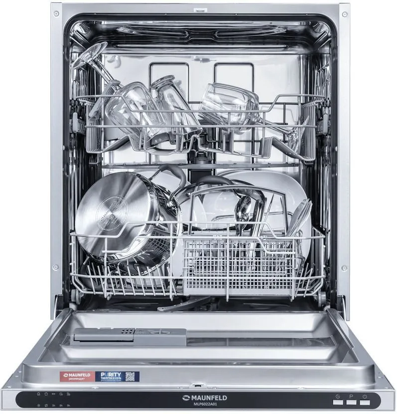 MAUNFELD MLP6022A01— полноразмерная встраиваемая посудомоечная машина, которая избавит вас от необходимости мыть посуду вручную . Вместимость — до 12 комплектов посуды. За раз можно помыть сразу много посуды — это оценят большие семьи и те, кто любит готовить или часто принимает гостей. В машине максимально эффективно организовано внутреннее пространство. Есть удобная корзина для столовых приборов и мелкой утвари. Верхняя корзина — с изменяемой высотой установки, чтобы можно было мыть посуду разного размера и объёмов. В верхней корзине есть складные держатели для бокалов — дополнительное важное удобство. Предусмотрены несколько программ мытья для посуды разной степени загрязнения. Посудомоечная машина MAUNFELD MLP6022A01— помоет посуду без вашего участия, освобождая время для более приятных занятий.