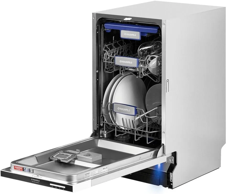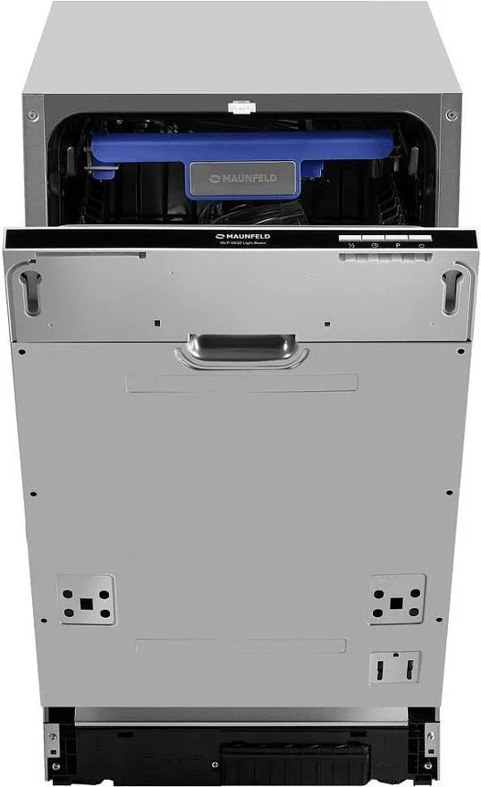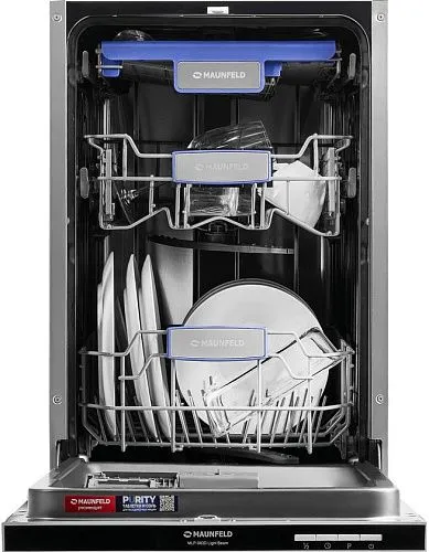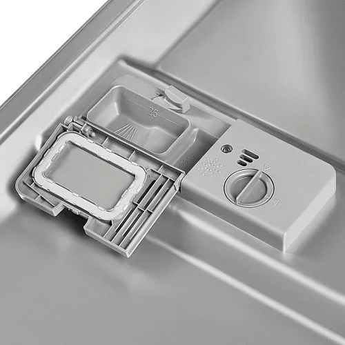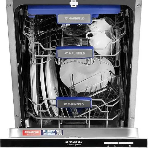 Электронное управление с дисплеем расположено в торце загрузочной дверцы. Функционал данной модели позволяет вам выбрать программу мойки, включить половинную загрузку, выставить время отсрочки старта (1-24 часов).