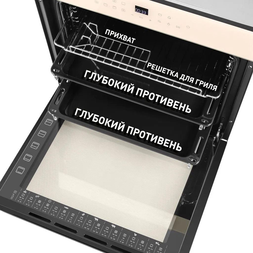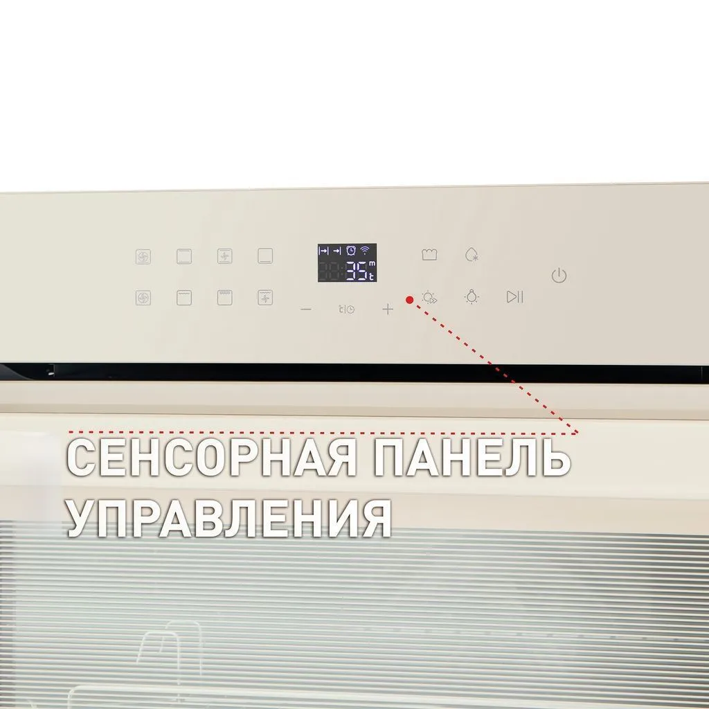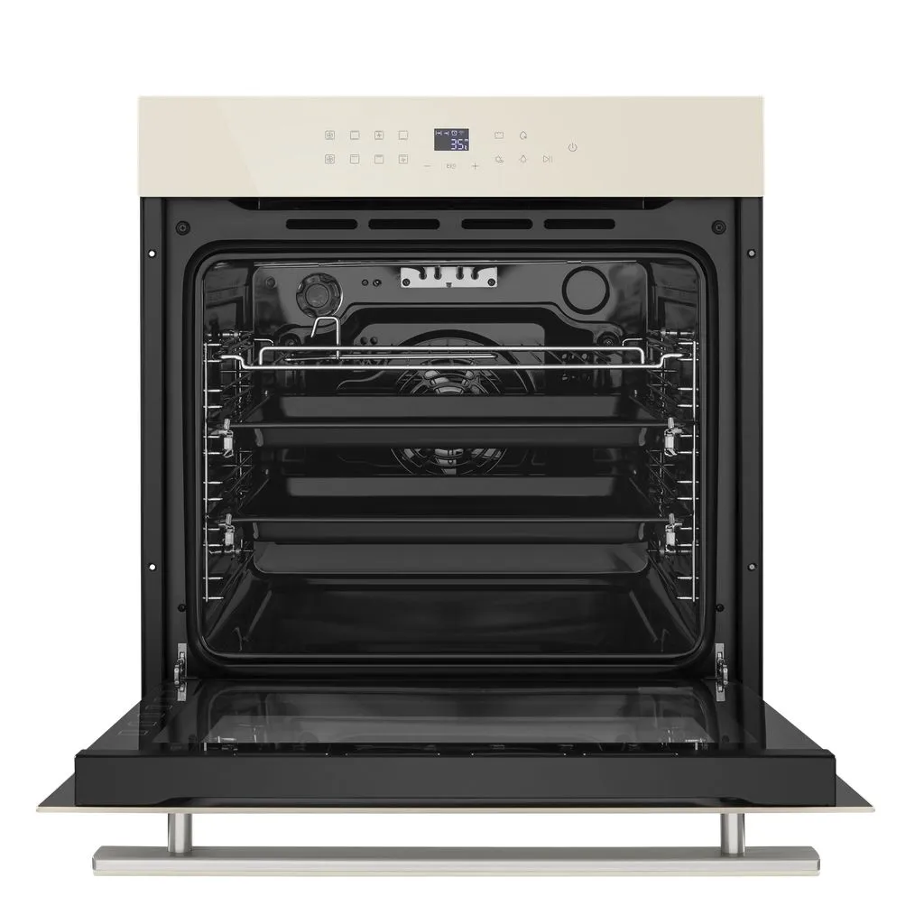 Фронтальная панель дверцы, лицевая часть блока управления и фасад ручки дверцы сделаны из высококачественного жаропрочного стекла бежевого цвета, окрашенного по всему объему, что является отличительной чертой бытового прибора премиум-класса.