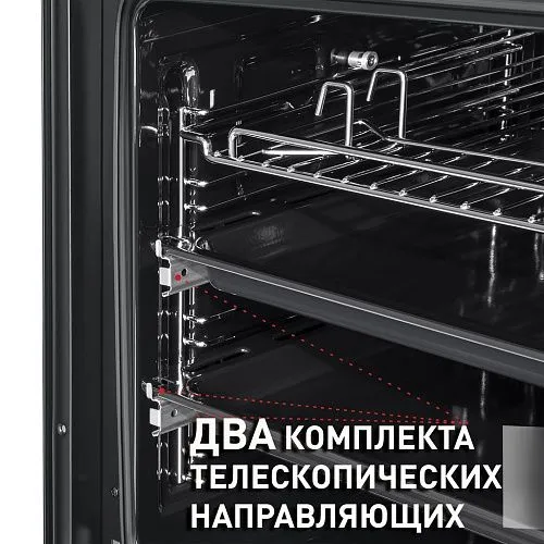 Объем 76 л при стандартных размерах 60 см позволяет готовить одновременно несколько блюд, разместив решетку или противень на одном из 6 уровней боковых направляющих. Два уровня оснащены удобными телескопическими направляющими. Внутреннее покрытие камеры выполнено из специальной легкоочищающейся эмали черного цвета.