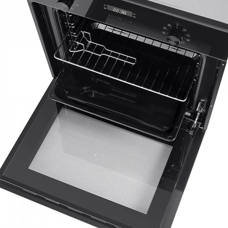 Стекло с трамп-линией позволяет создавать визуальный эффект однородности стекла, при выключенном освещение внутренее содержимое духовой камеры не видно, будь то сковородки, противни т.д, а при включенном освещение весь процесс приготовления виден без помех.