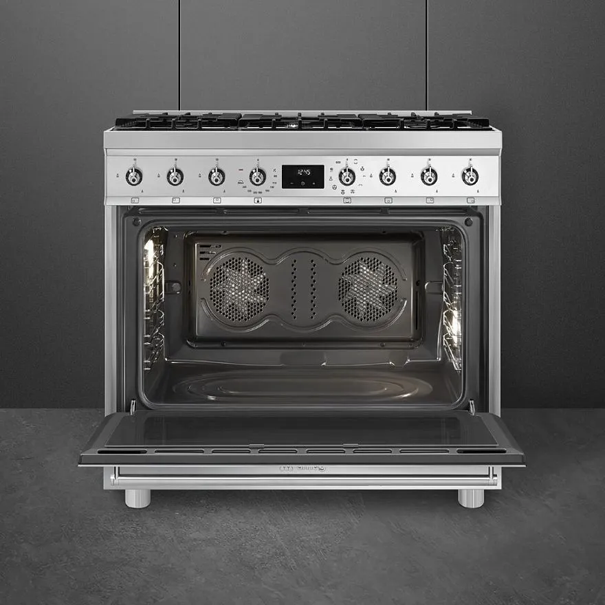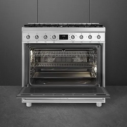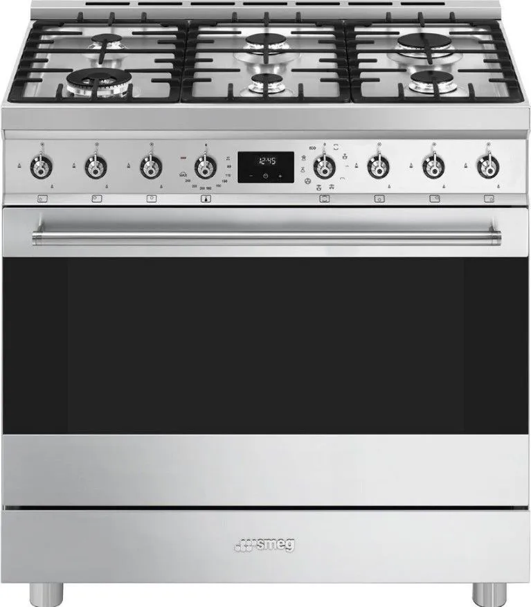 Варочный центр Smeg C9GMX2 в цвете нержавеющей стали — комбинированная модель с цифровым дисплеем. Газовая варочная панель оснащена 6 конфорками, что позволит готовить оптимальное количество блюд одновременно. Духовой шкаф с 9 режимами оснащен режимом гриля для идеального запекания мяса. Паровая очистка камеры размягчит все загрязнения на стенках, после чего они легко удалятся губкой.