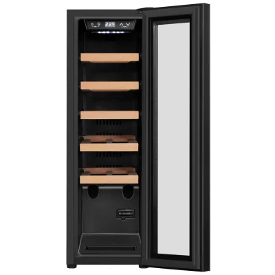 Изысканный дизайн модели делает её абсолютным выбором большинства: корпус выполнен из металла, окрашенной в чёрный цвет. Современная технология освещения зоны позволит вам в любое время эффектно продемонстрировать вашу винную коллекцию гостям. Каждая деталь модели гармонично дополняет друг друга, делая винный шкаф универсальным под любые стили интерьера.