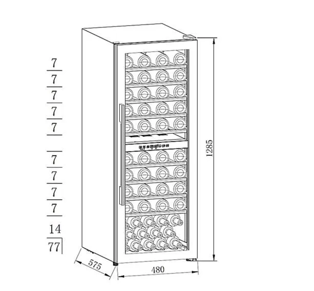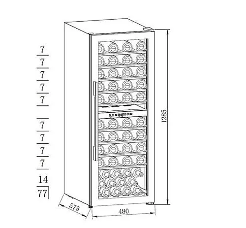 Внутреннее пространство рассчитано на хранение до 77 бутылок. При желании можно извлечь полку и разместить большее количество бутылок.