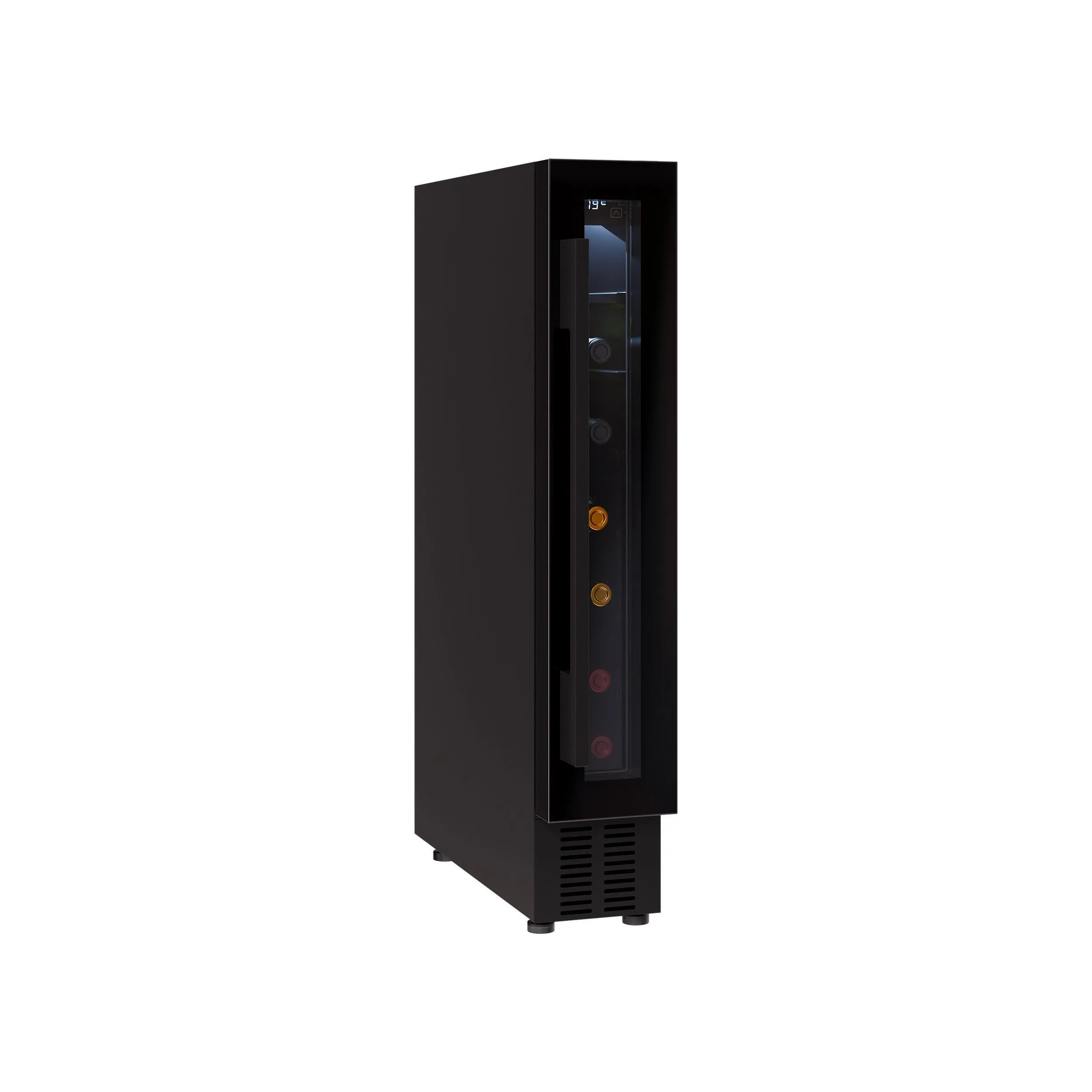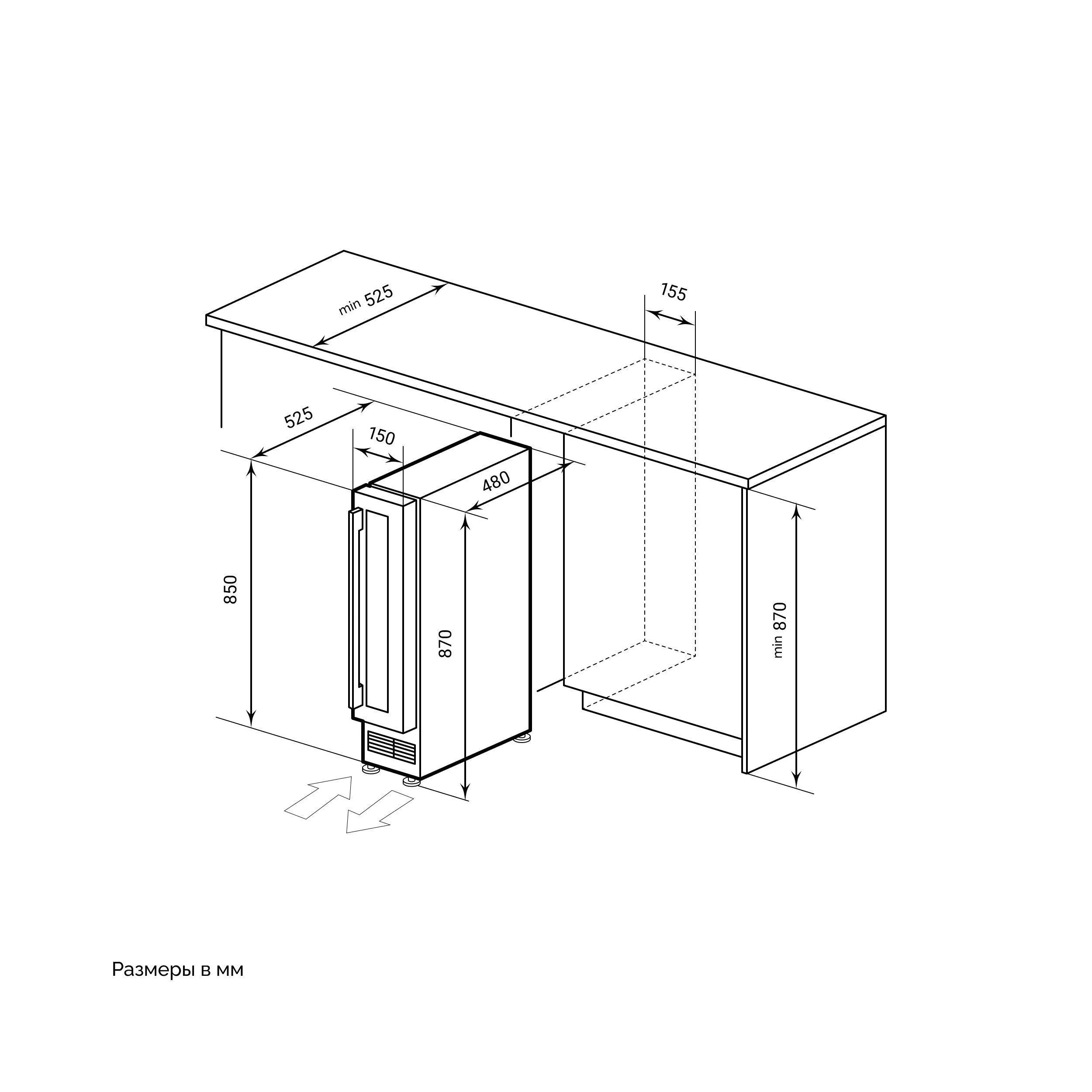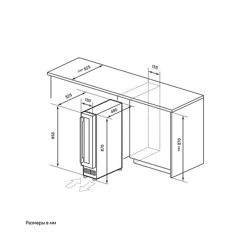 Благодаря компактным размерам (870×150×525 мм), шкаф легко поместится под столешницу или в ограниченном пространстве. Шесть полок обеспечивают гибкость в размещении бутылок различных размеров.
