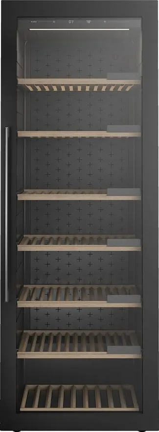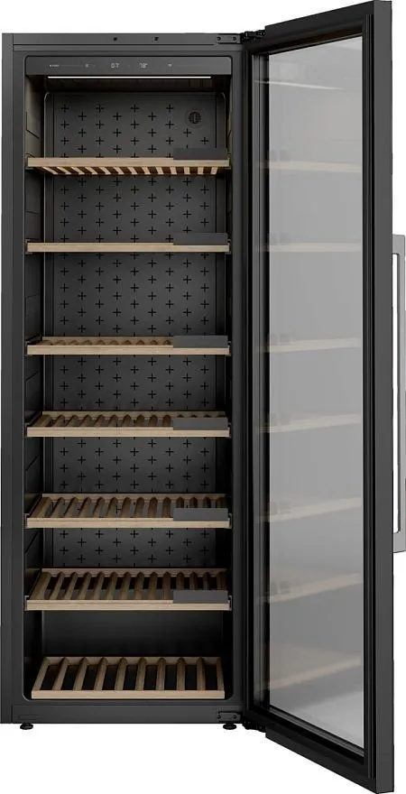 Внутри размещено 7 деревянных полок, гасящих вибрацию, на которых можно удобно уложить 261 бутылку. На каждом уровне есть специальная табличка для названия расположенных на ней напитков.