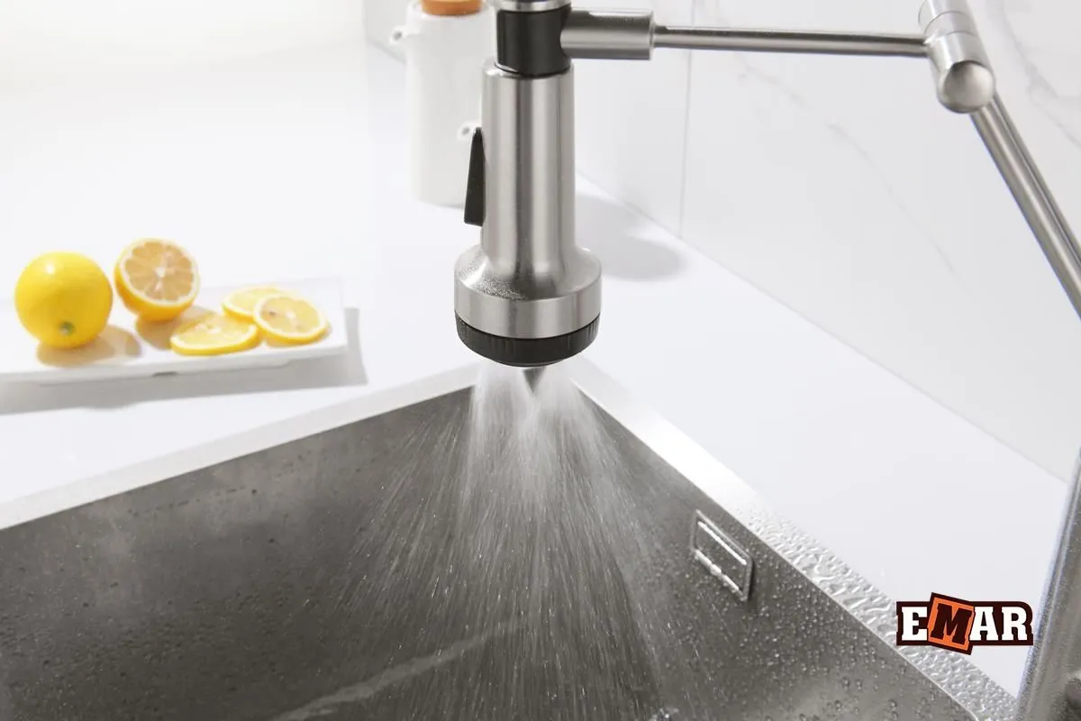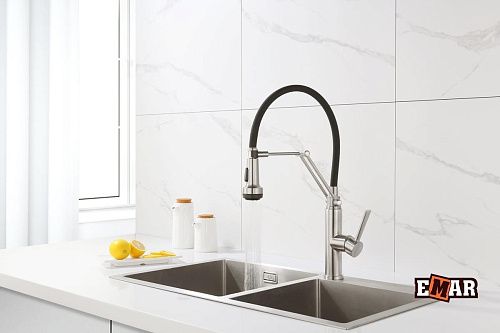 Смеситель сделан из нержавеющей стали и обладает 4-мя режимами переключения воды. Гусак смесителя сделан из эластичной резины. Благодаря различным режимам переключения воды и выдвижному гусаку - можно достать трудные места для мытья кухонной мойки.