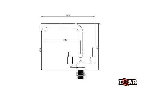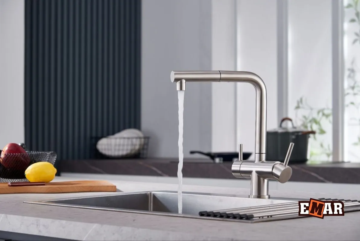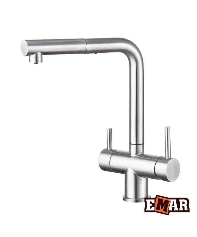 Смеситель для кухни из нержавеющей стали EMAR ЕСB - 7017 Black с возможностью подключения фильтра питьевой воды и выносным душем, с керамическим дисковым картриджем. Рабочая температура подачи воды до 80 °С.
