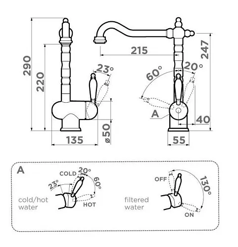 Новая удобная технология системы ручки 2 в 1 Multi позволяет переключить с водопроводной на фильтрованную воду в одно касание.