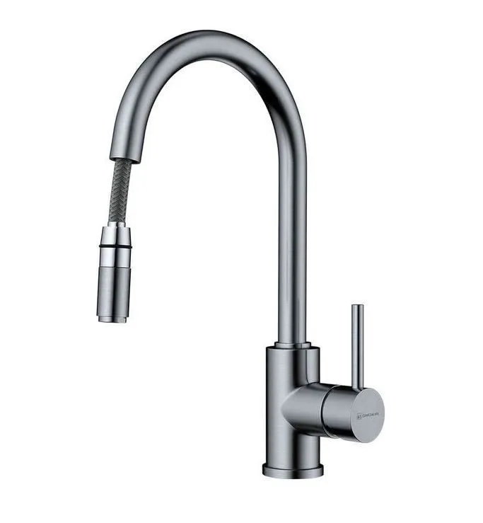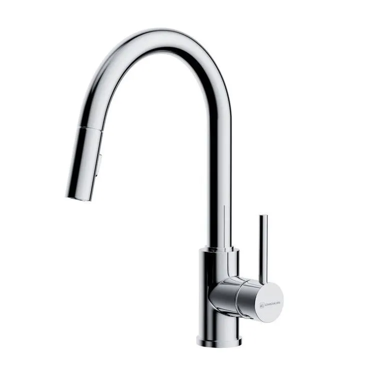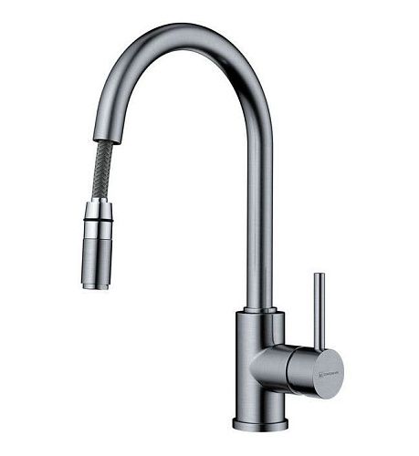 Практичный однорычажный смеситель выполнен в современном стиле и снабжен вытяжным шлангом.