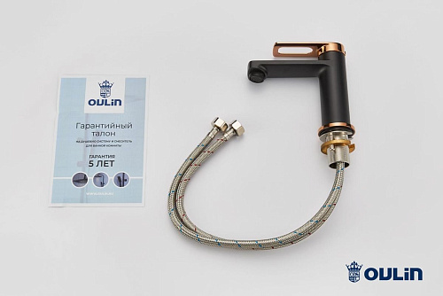 Смеситель, набор креплений, гибкая подводка, инструкция и гарантийный талон.
