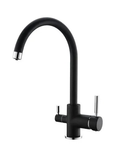 Кухонный смеситель с возможностью подключения фильтра для очистки воды. Фильтрованная вода подается отдельной ручкой через отдельную трубку и не смешивается с водопроводной водой. Однорычажное управление поможет легко регулировать температуру и напор подачи воды. Соответствует стандартам DIN DVGW.